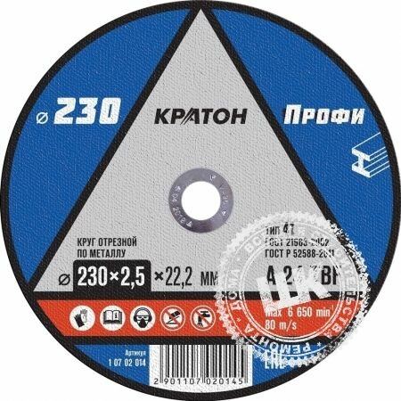 Круг отрезной по металлу A24TBF 230x2,5x22,2 мм Кратон 10шт информация: