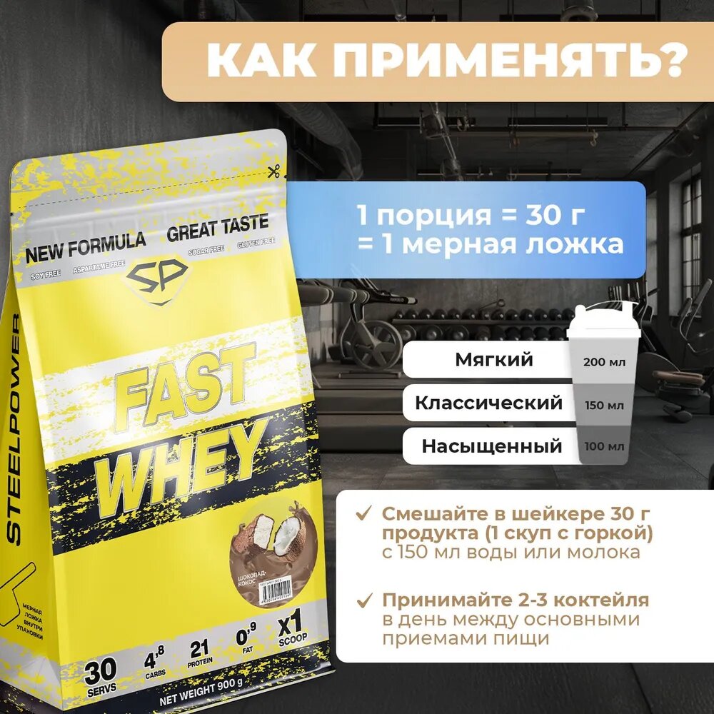 Протеин сывороточный STEELPOWER / Протеиновый коктейль для похудения / Сывороточный протеин FAST WHEY, 900 гр, Шоколад Кокос (Баунти)