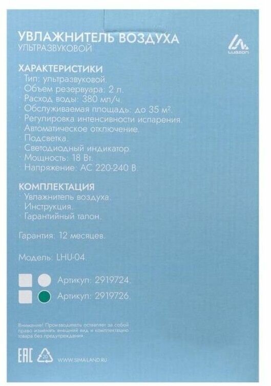 Увлажнитель воздуха Luazon Home LHU-04, ультразвуковой, 18 Вт, 2 л, 35 м2, белый информация: