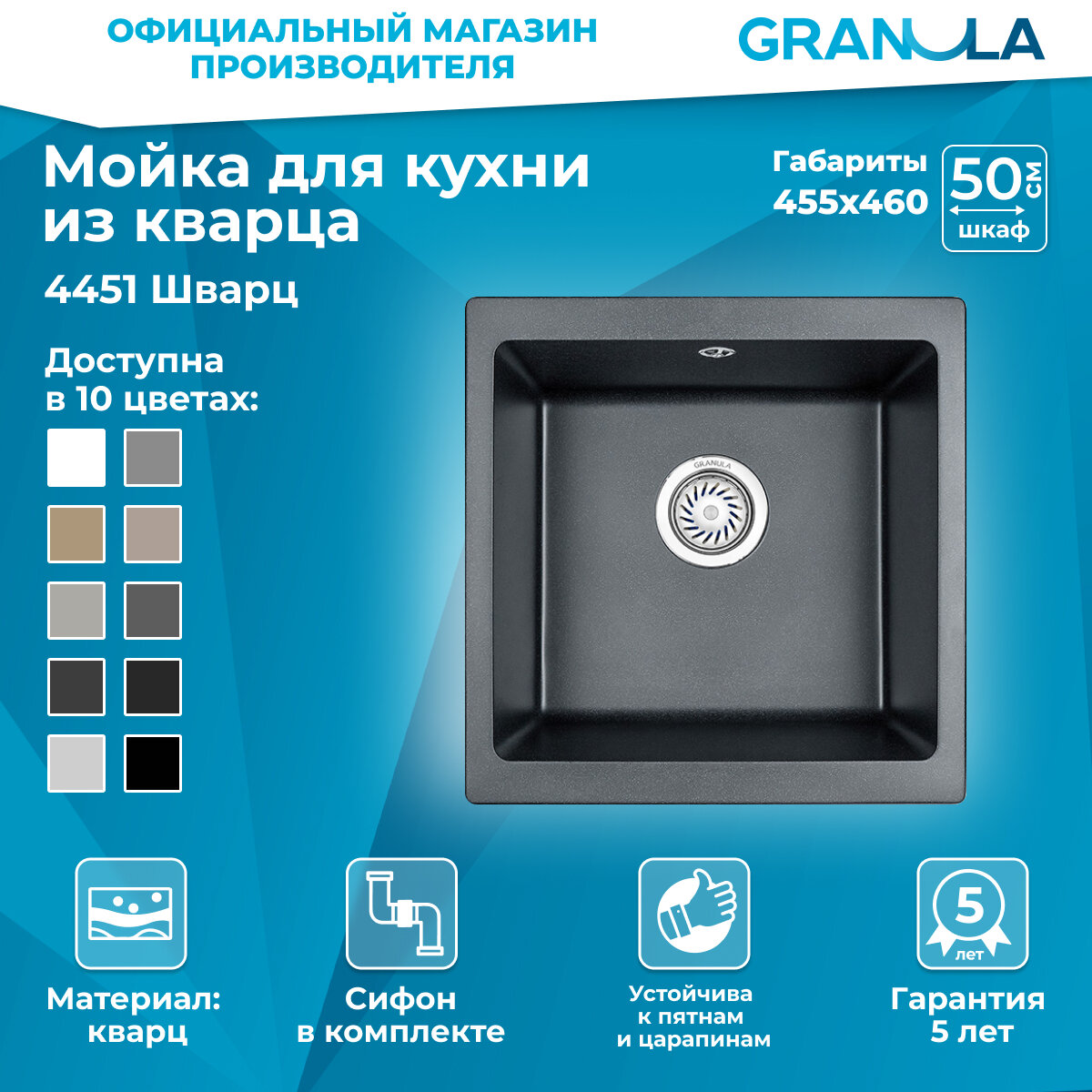 Мойка для кухни врезная кварц GRANULA 46x45x20 Кухонная раковина в комплекте с сифоном. Цвет черный