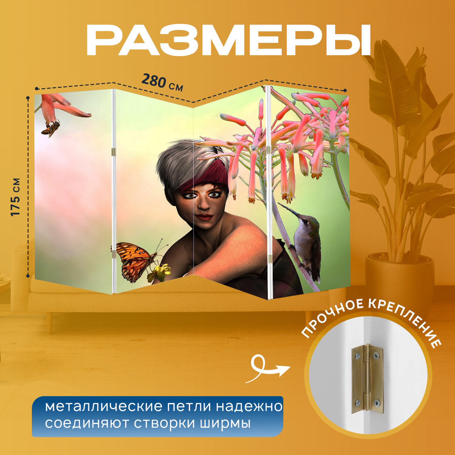 10 цен на Ширма "Колибри, женщина, цветы" перегородка для зонирования комнаты с принтом 280x175 см. на холсте