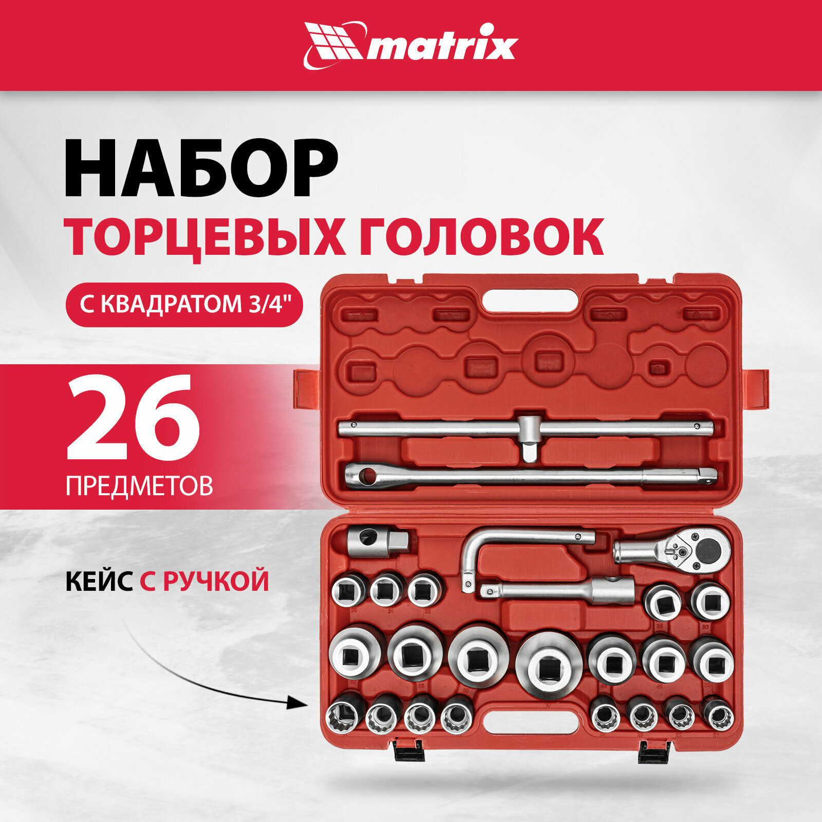 10 цен на Набор торцевых головок 3/4" 1", головки 21 х 65 мм, 26 предметов, в пласт. боксе Matrix