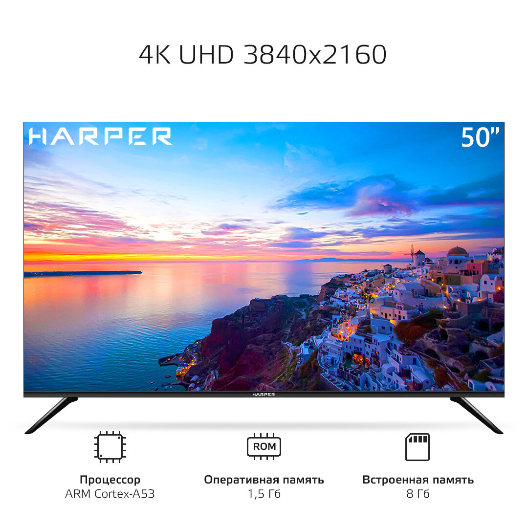 HARPER 50U660TS {Ultra HD 4K (3840 x 2160); Наличие цифрового тюнера: T2/S2; SMART; Габариты упаковки (ШГВ): 1126x250x686; Объем, м3: 0,1563; Вес, кг: 13,2}
