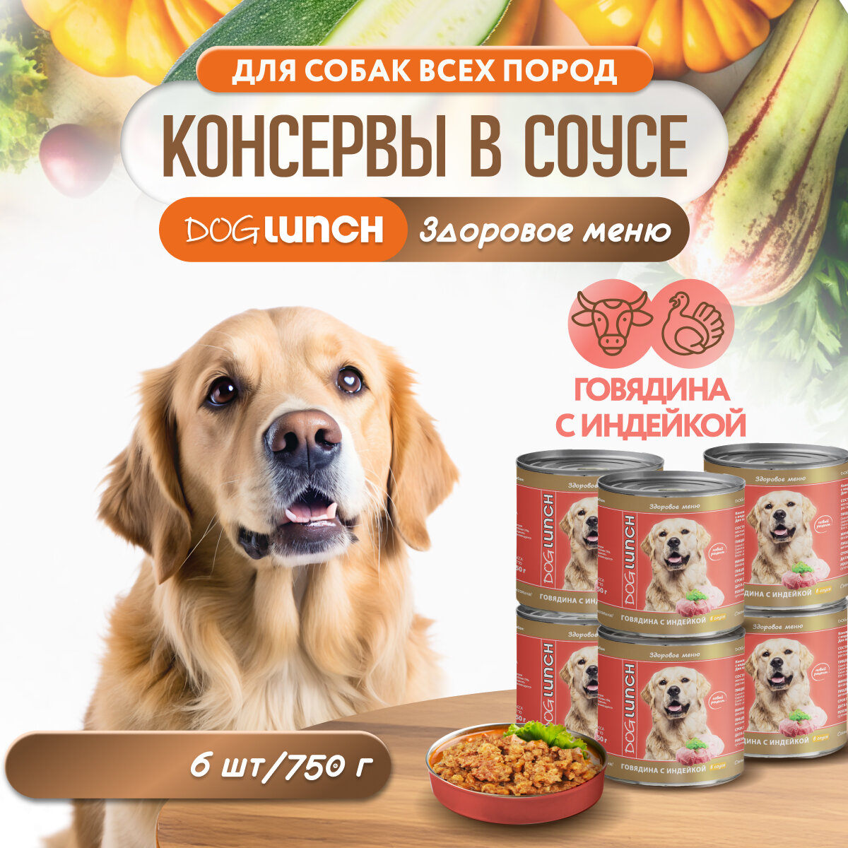 Корм влажный DOG LUNCH говядина и индейка в соусе для собак (6шт x 750г) информация: