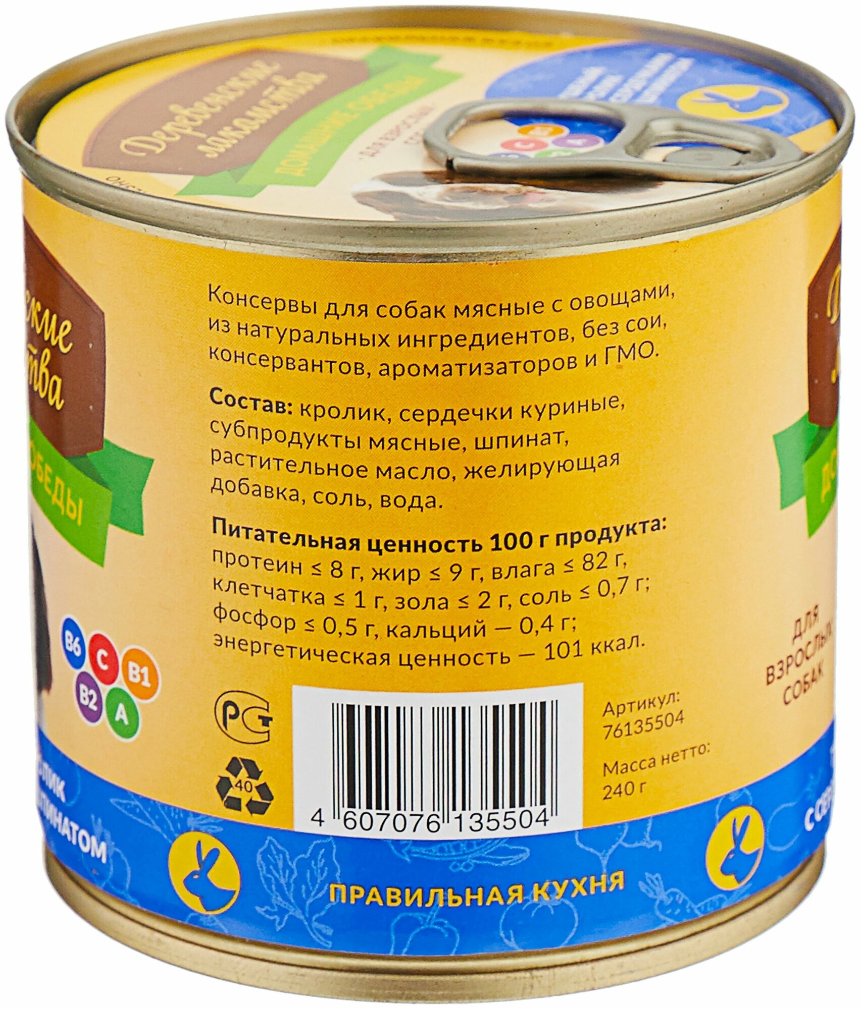 Деревенские лакомства Домашние обеды 1 шт по 240г кролик с сердечками и шпинатом консервы для собак 272 ₽