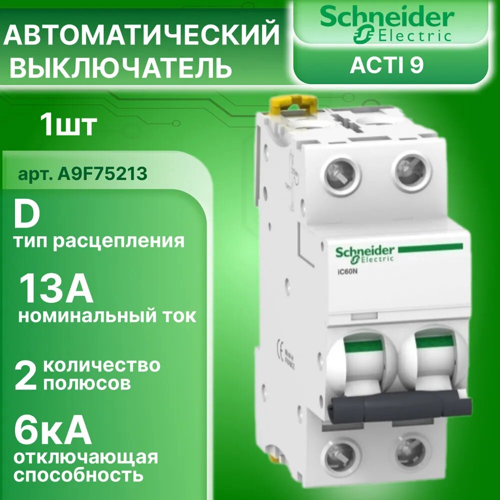 Автоматический выключатель 2P (2П) 13А тип D 6кА Acti9 iC60N Schneider Electric A9F75213 1шт информация: