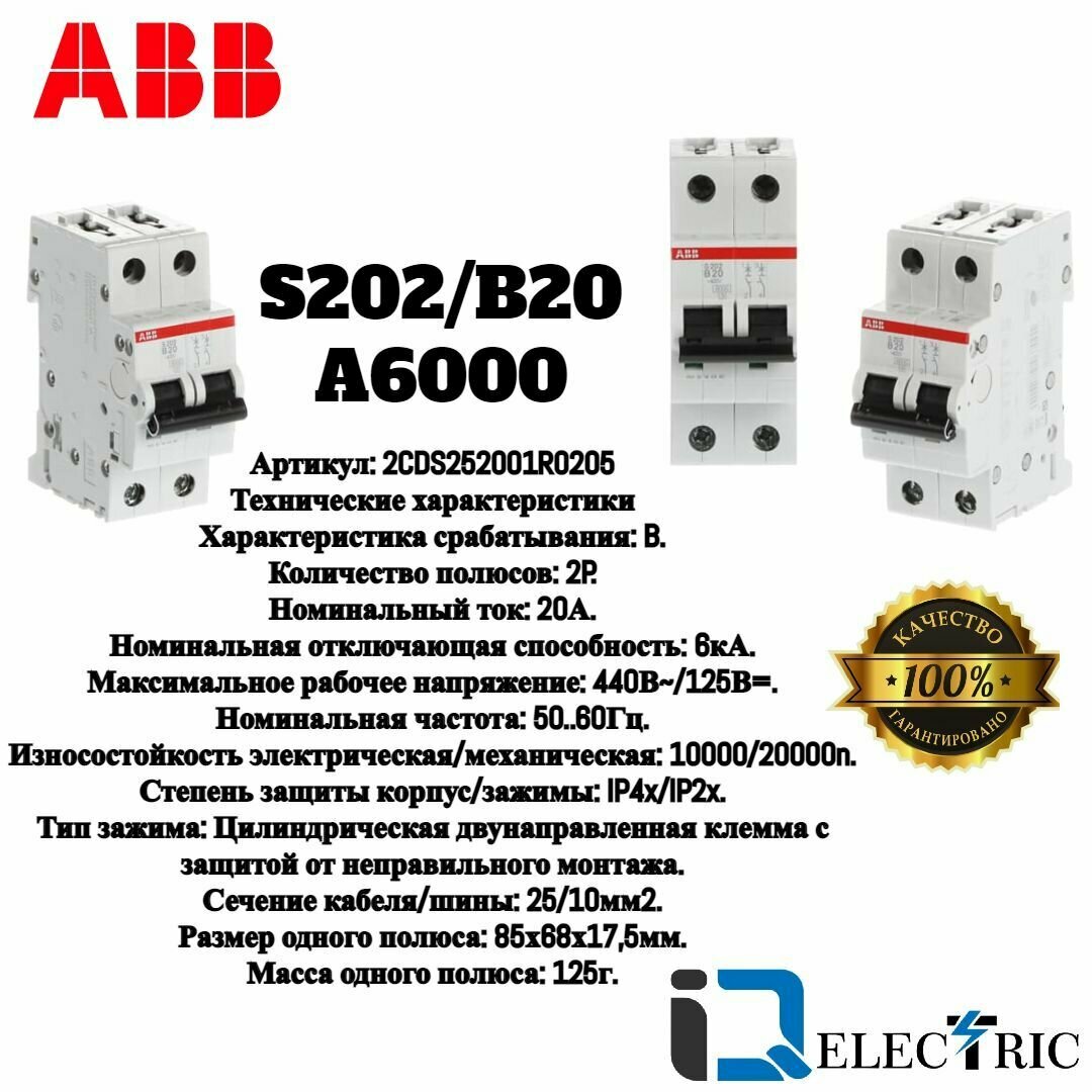 Автоматический выключатель на Din-рейку 2CDS252001R0205 B20 АВB S202 B20А/2п/ 6,0кА информация: