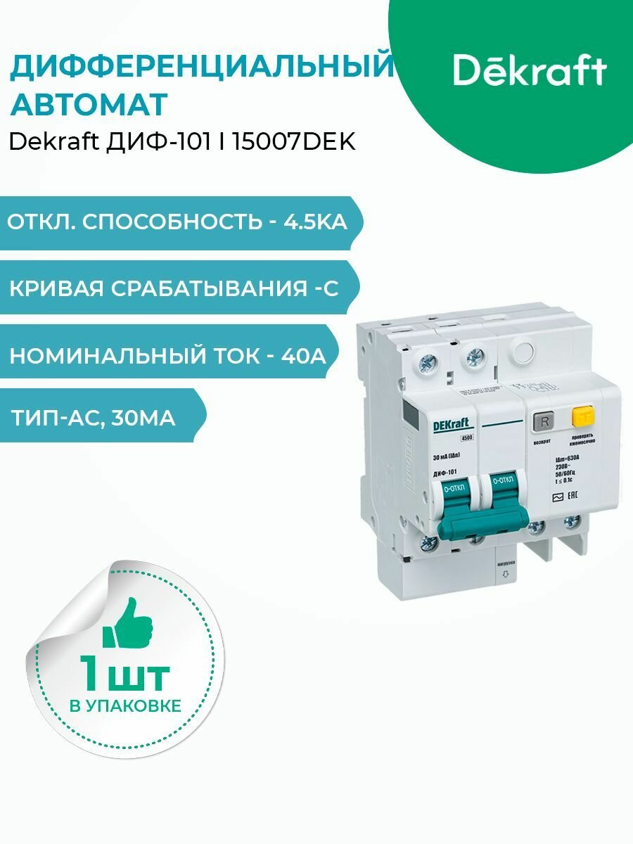 15007DEK Дифференциальный автоматический выключатель DEKraft ДИФ-101 2П 40А 30мА, тип AC, 4.5кА, C