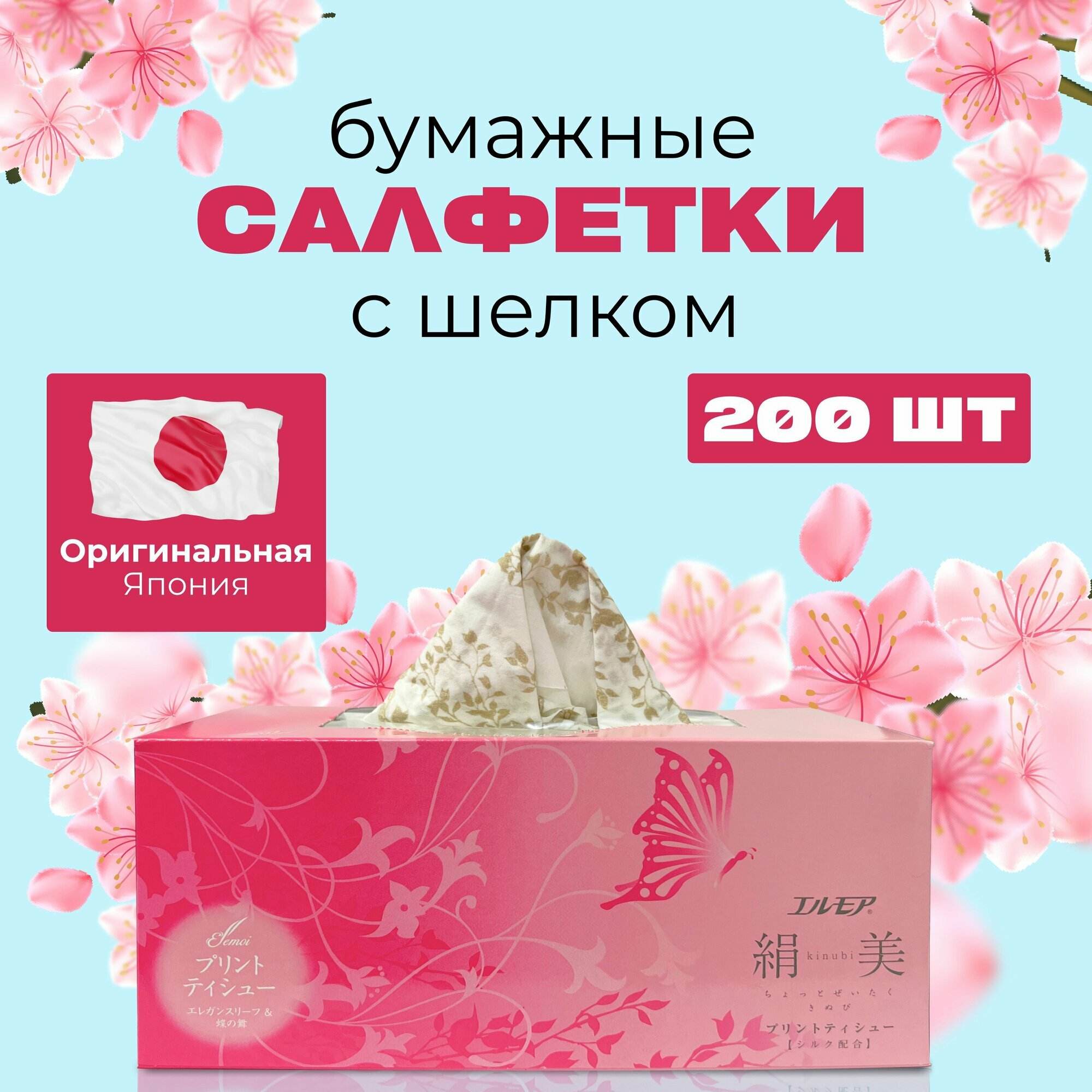 Салфетки бумажные с шелком, двухслойные Kami Shodji ELLEMOI "Kinu-bi", 200 шт, Япония / Салфетки косметические в коробке, японское премиум качество, сухие для всей семьи