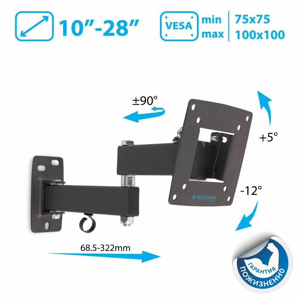 Отзывы на Кронштейн для телевизора Kromax OPTIMA-104 черный 10"-28" максимум: 25кг настенный поворотно-выдвижной и наклонный