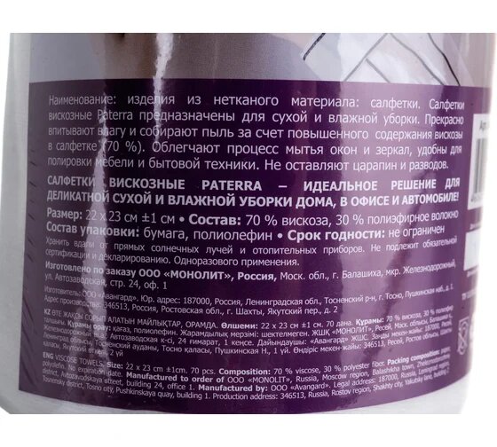 Салфетки хозяйственные Paterra вискозные, спанлейс, 70 шт, 22х23 см информация: