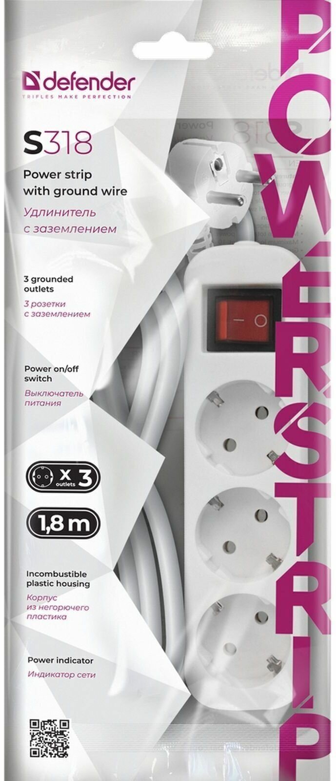 Удлинитель Defender S318 1.8 метра 3 розетки с заземлением выключатель, белый