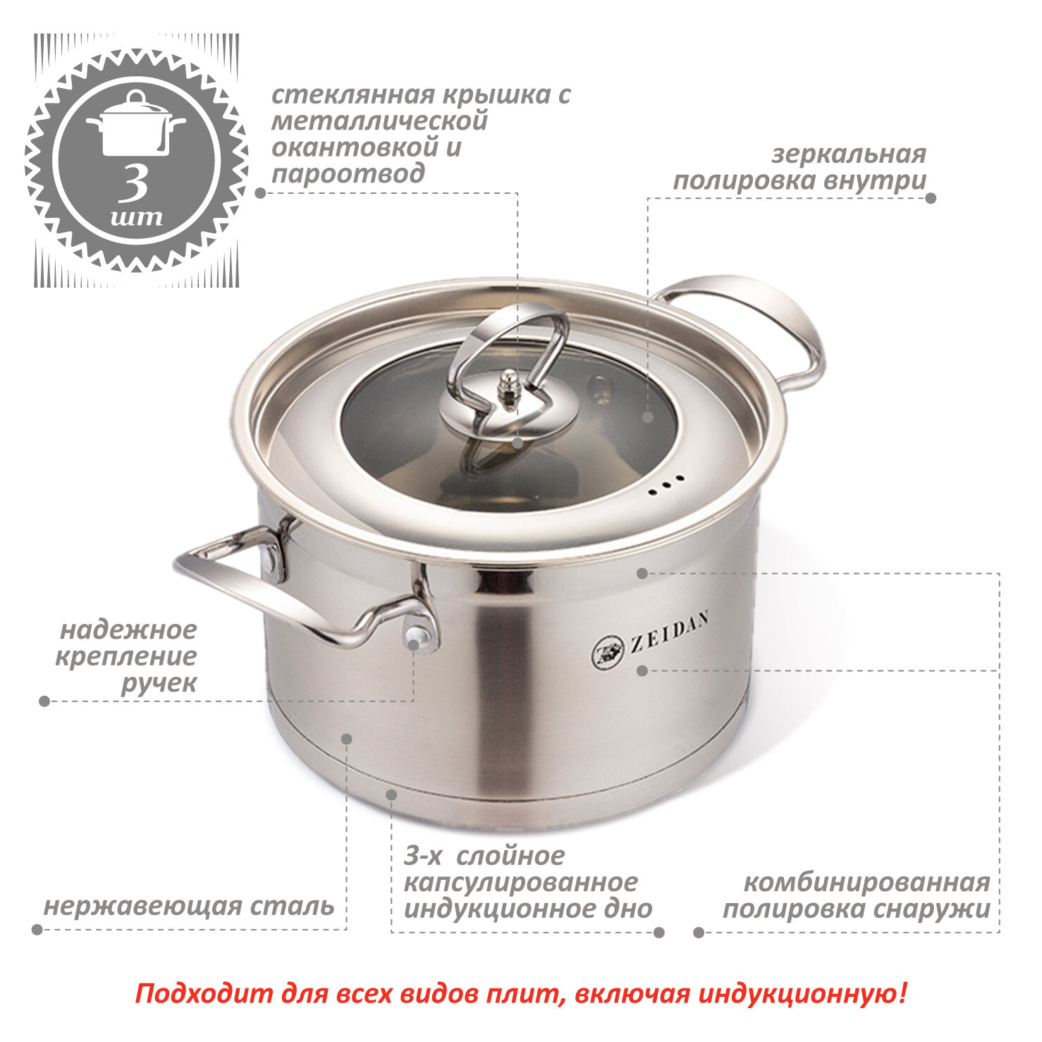 Набор кастрюль ZEIDAN из нержавеющей стали с крышками, 6 предметов информация: