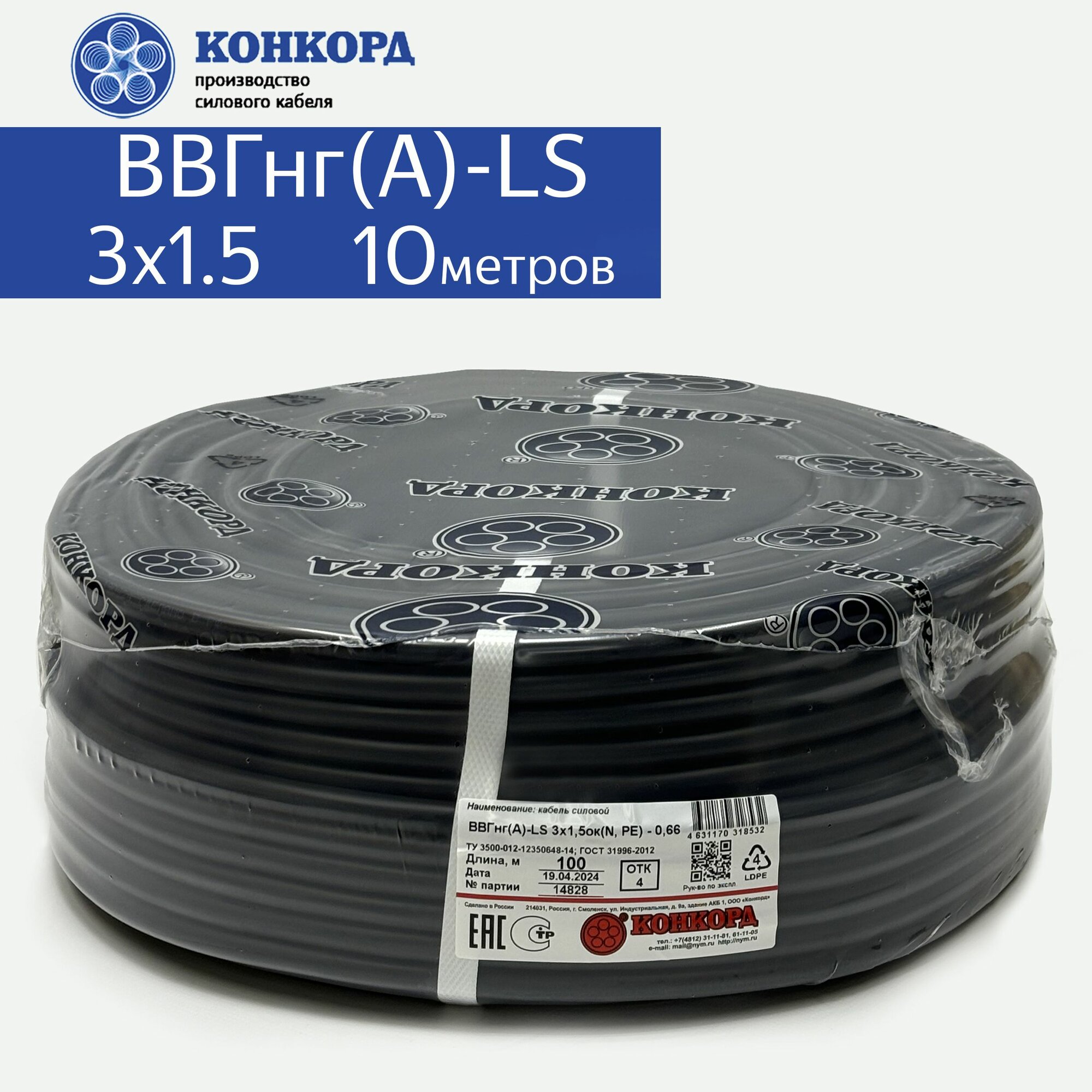 Силовой кабель ВВГнг(A)-LS 3х1.5 10метров Конкорд ГОСТ информация: