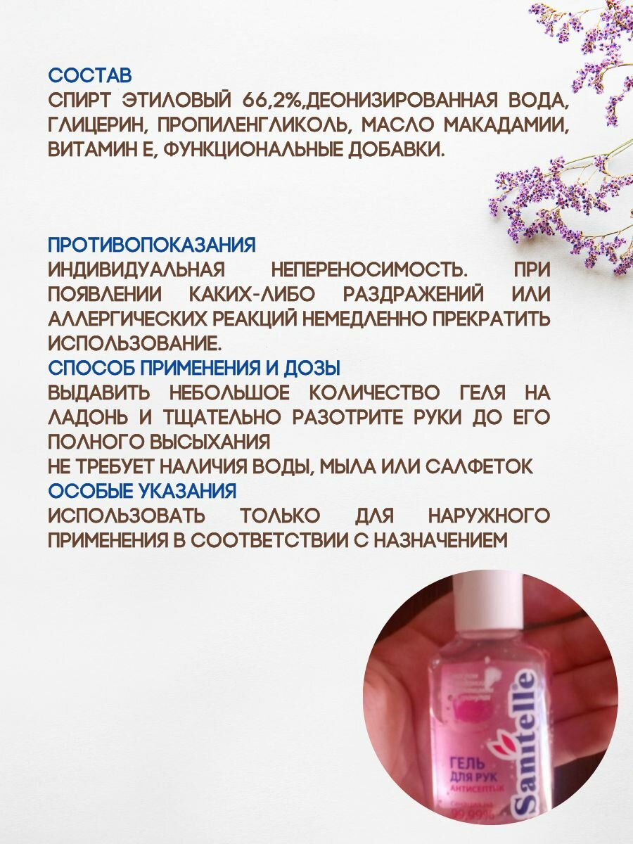 Sanitelle, Гель антисептический с ароматом Вишня, масло макадамии, витамин Е, 50 мл