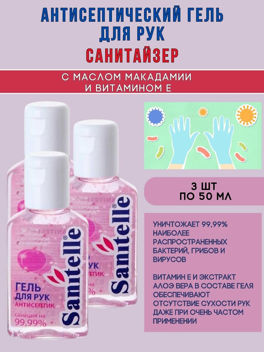 Гель для рук Sanitelle с маслом макадамии и витаминами, 3 штуки по 50 мл информация: