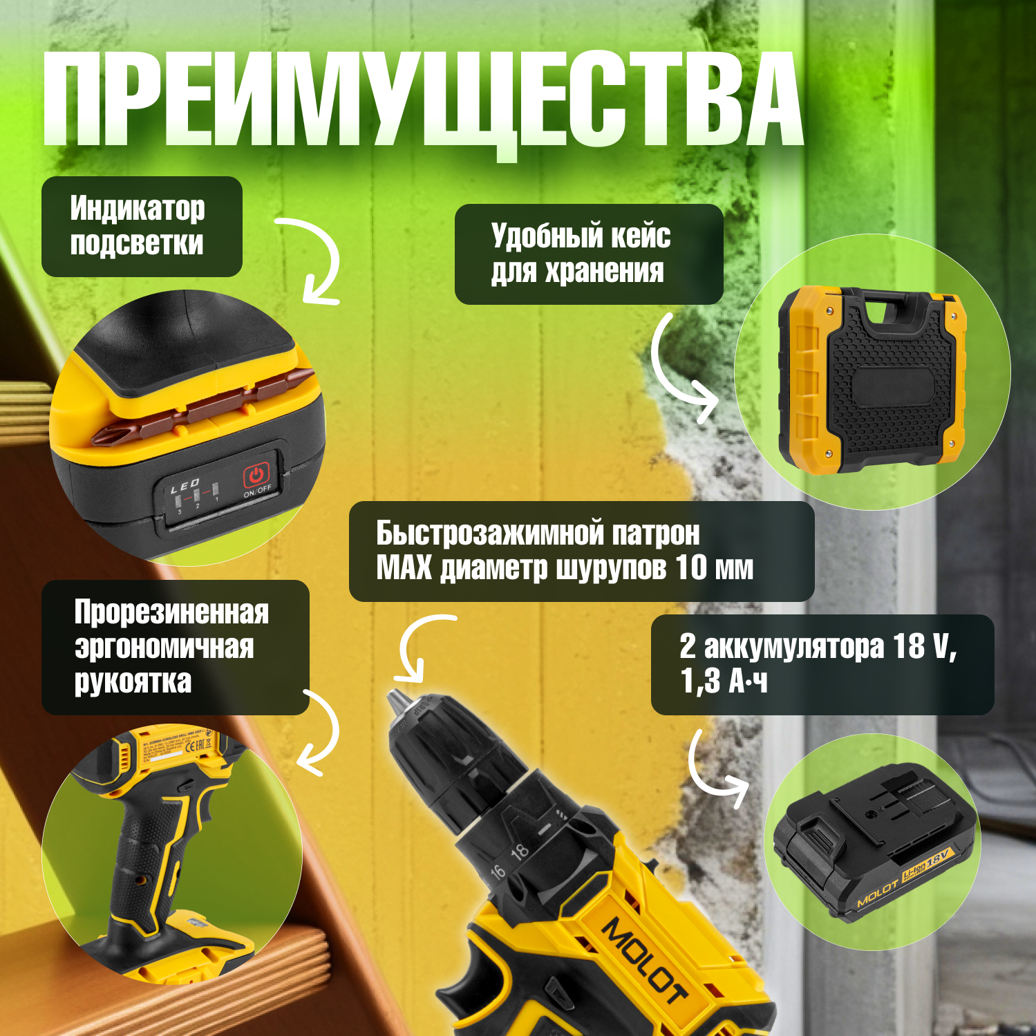 10 цен на Дрель-шуруповерт аккумуляторный MOLOT MBD 1815 Li (1335504)