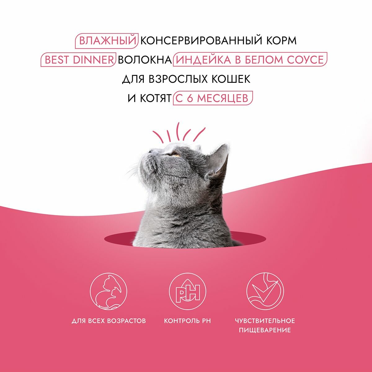 Корм влажный для кошек Бест Диннер (Best DInner) мясные волокна с индейка в белом соусе, пауч (24шт*85гр) 2 712 ₽