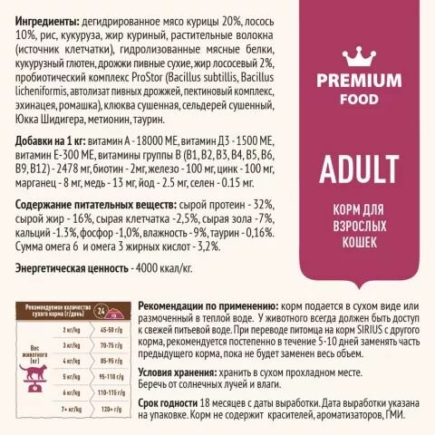 Сухой корм для кошек SIRIUS, лосось с рисом, 1,5 кг информация: