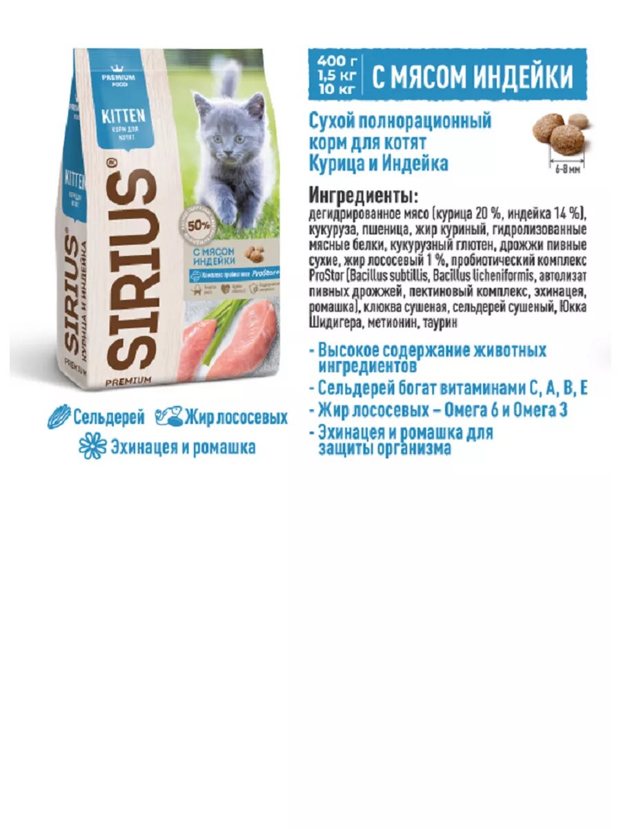 Sirius Сириус сухой полнорационный корм корм для котят с мясом Индейки 400гр