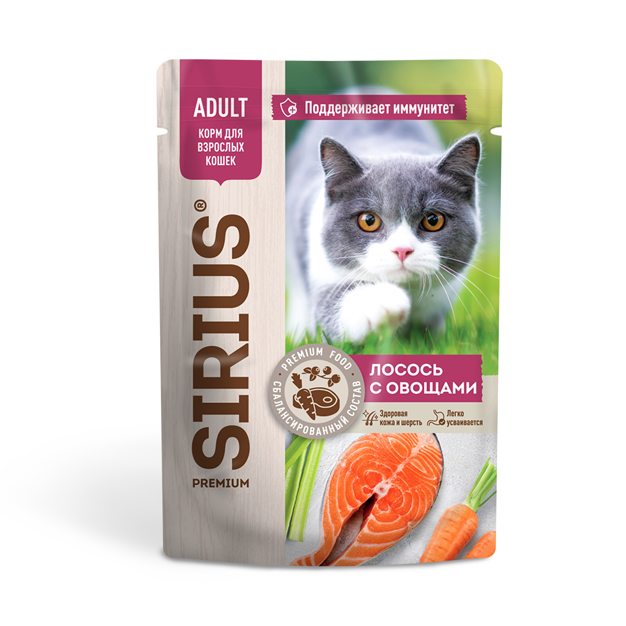 Влажный корм SIRIUS для кошек , кусочки в соусе, лосось с овощами, 24 шт х 85 г 1 907 ₽
