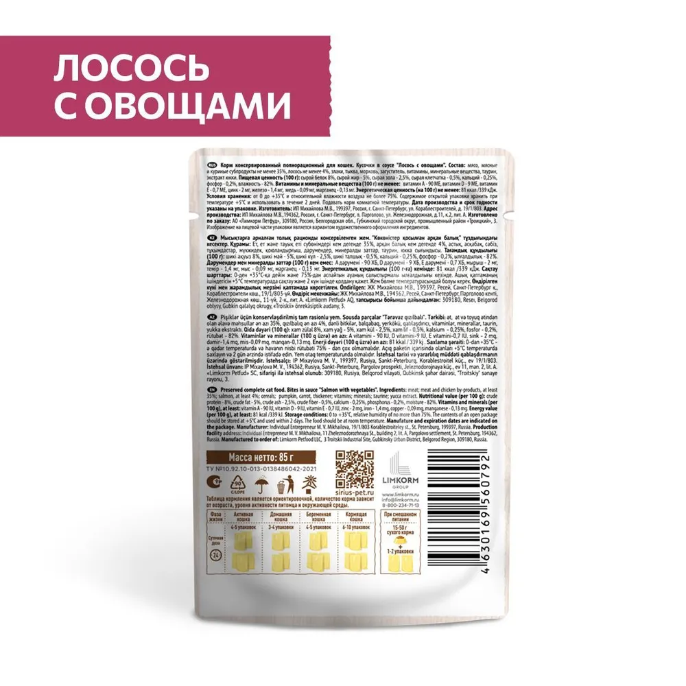 Sirius паучи для кошек, кусочки в соусе, лосось с овощами 85г х 24 информация: