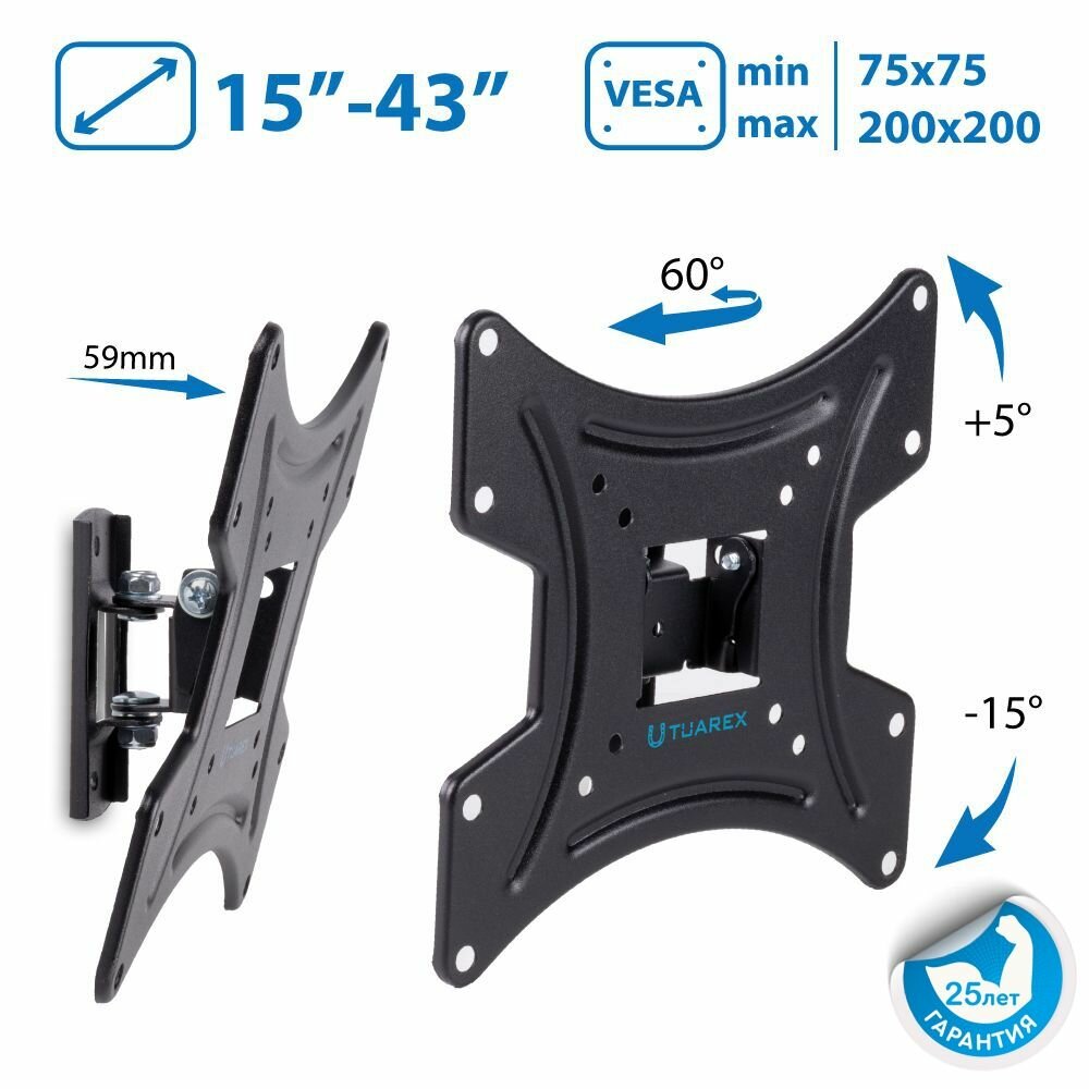 Кронштейны для техники Noname Кронштейн настенный Tuarex ALTA-202 15"-43" (наклон +5/-15°, поворот 60°, до 20 кг, черный)