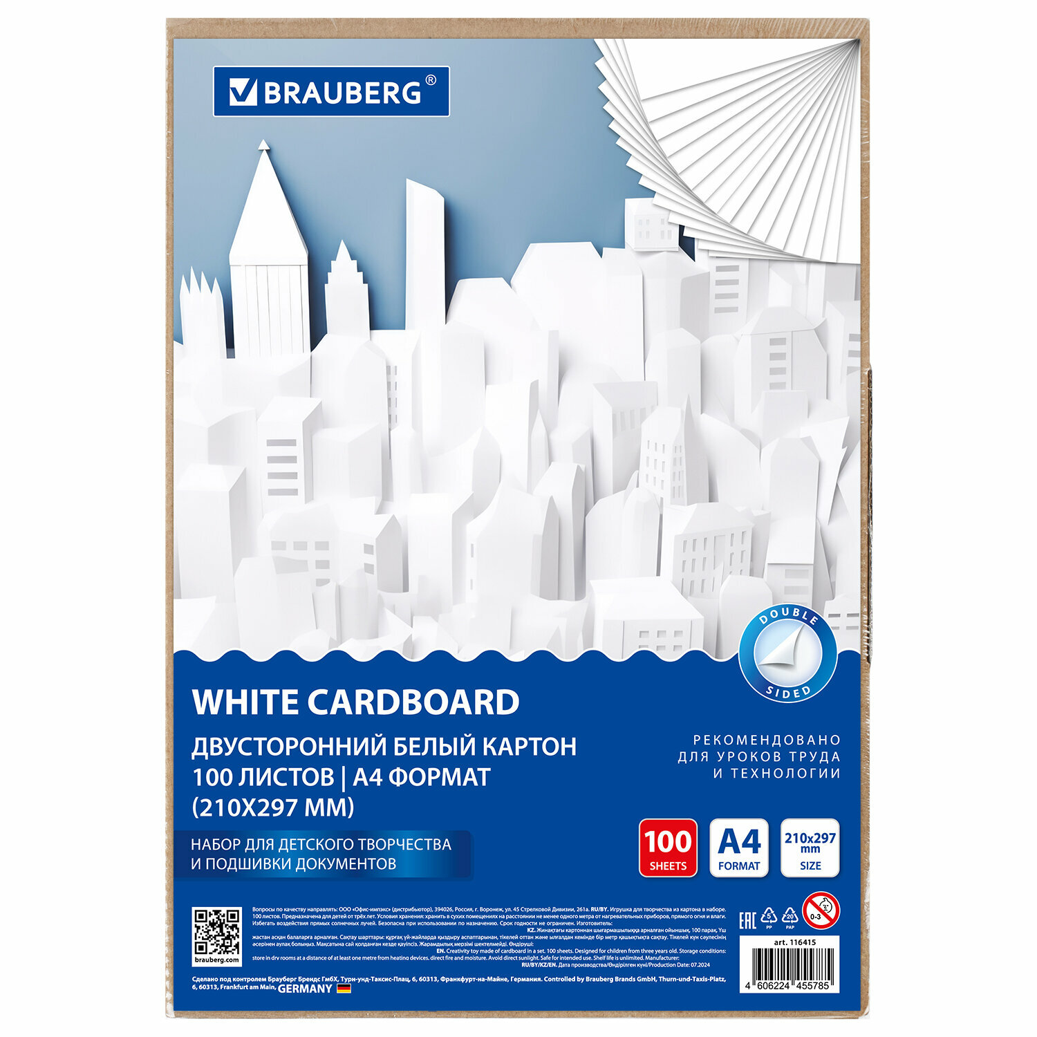 Белый картон для школы двусторонний набор А4 глянцевый, мелованный (белый оборот), 100 листов в коробке, 210х297 мм, канцелярия для школьников, творчества, рисования, Brauberg, 116415 информация: