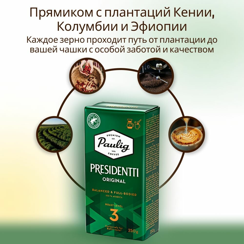Кофе молотый 750 грамм, 100% арабика, натуральный Paulig Presidentti Original (Паулиг Президент) средней обжарки (3 из 5) с ореховым ароматом и черной смородины, 250 г х 3 шт