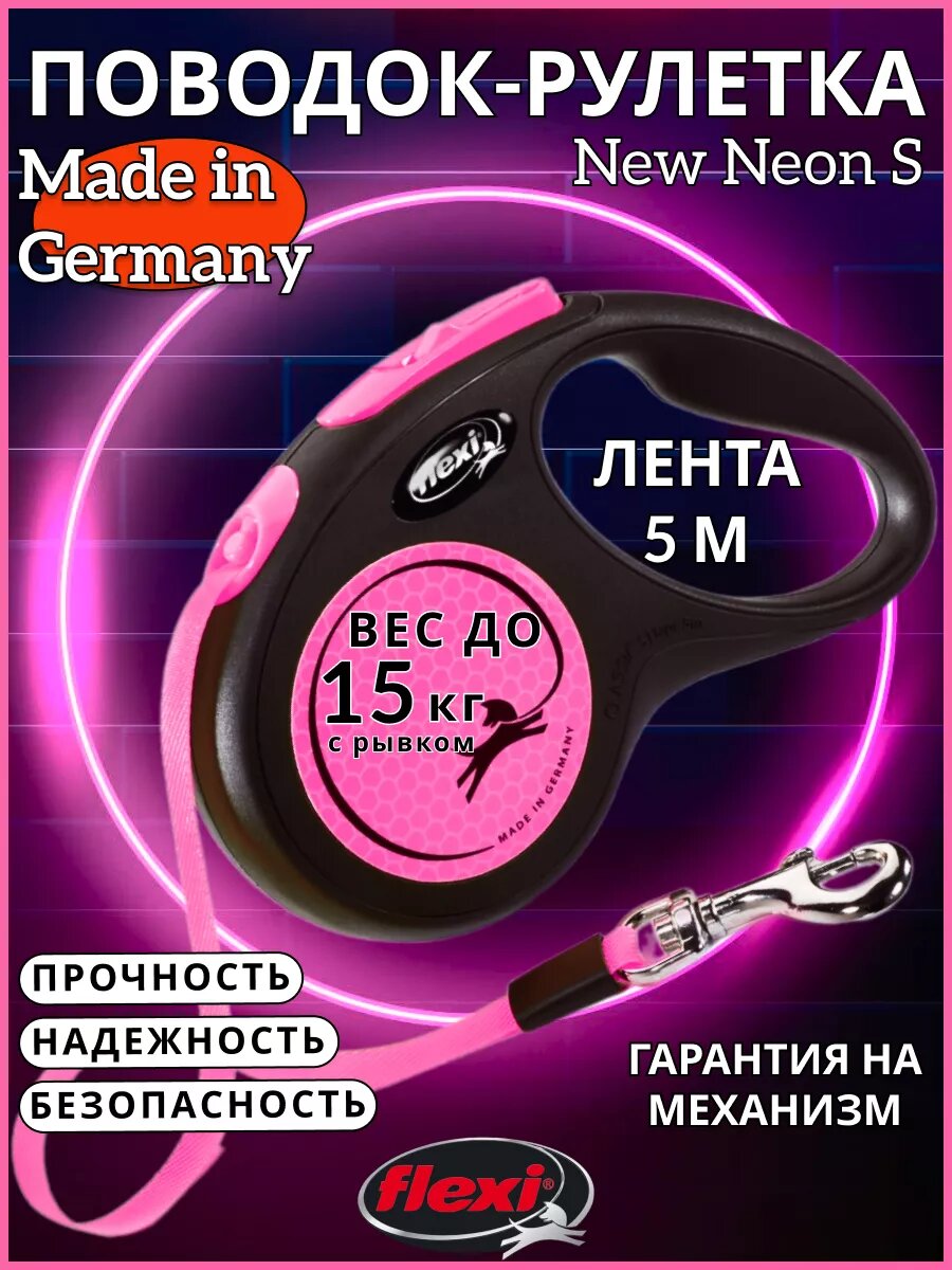 Поводок-рулетка для собак Flexi New Neon S, лента 5 метров, цвет - розовый информация: