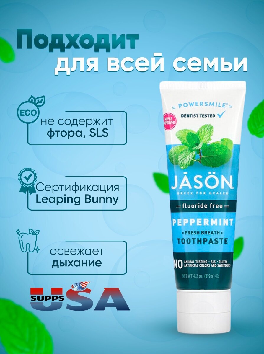 Jason Natural, Powersmile, зубная паста для свежего дыхания, без фтора, перечная мята, 119 г информация: