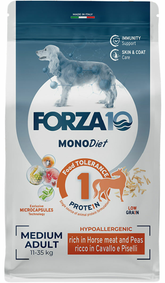 FORZA10 DOG MEDIUM MONODIET LOW GRAIN монобелковый низкозерновой для взрослых собак средних пород при аллергии с кониной и горохом (12 кг)