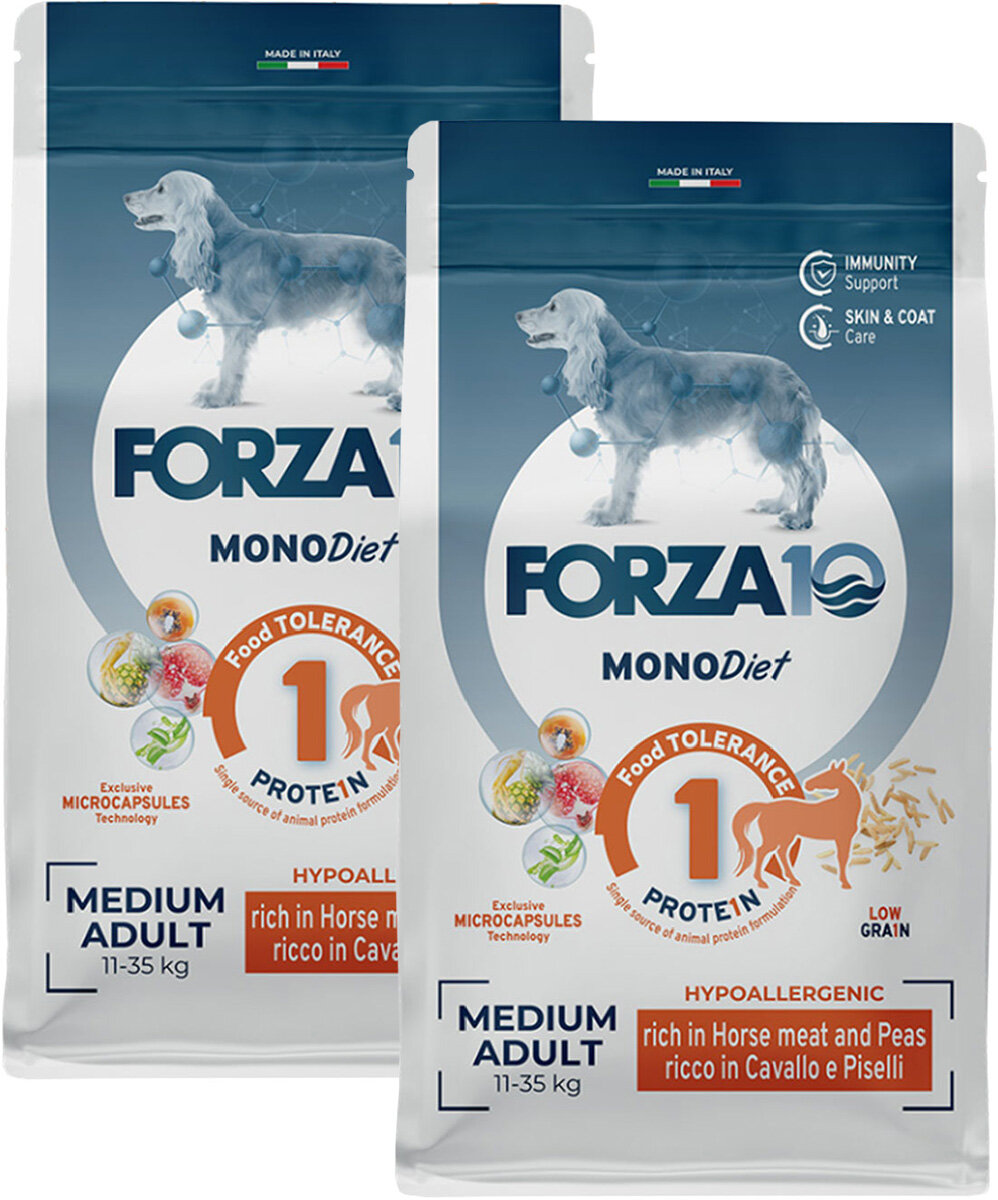 10 цен на FORZA10 DOG MEDIUM MONODIET LOW GRAIN монобелковый низкозерновой для взрослых собак средних пород при аллергии с кониной и горохом (1,5 + 1,5 кг)