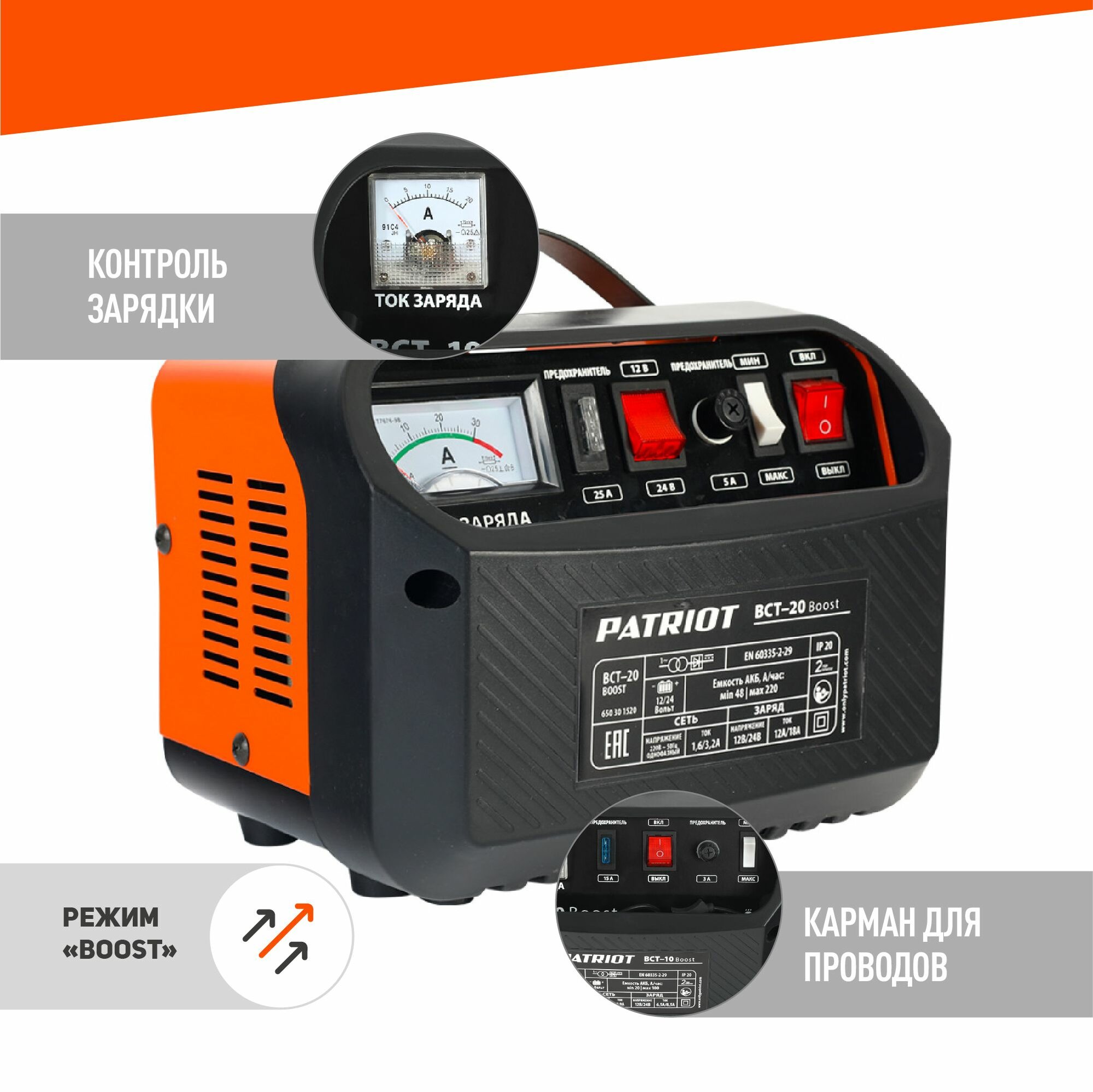 Устройство пуско-зарядное PATRIOT BCT-20 Boost 220В±15% 700Вт 12/24В зарядmax18А 48-220А/ч 6.2кг