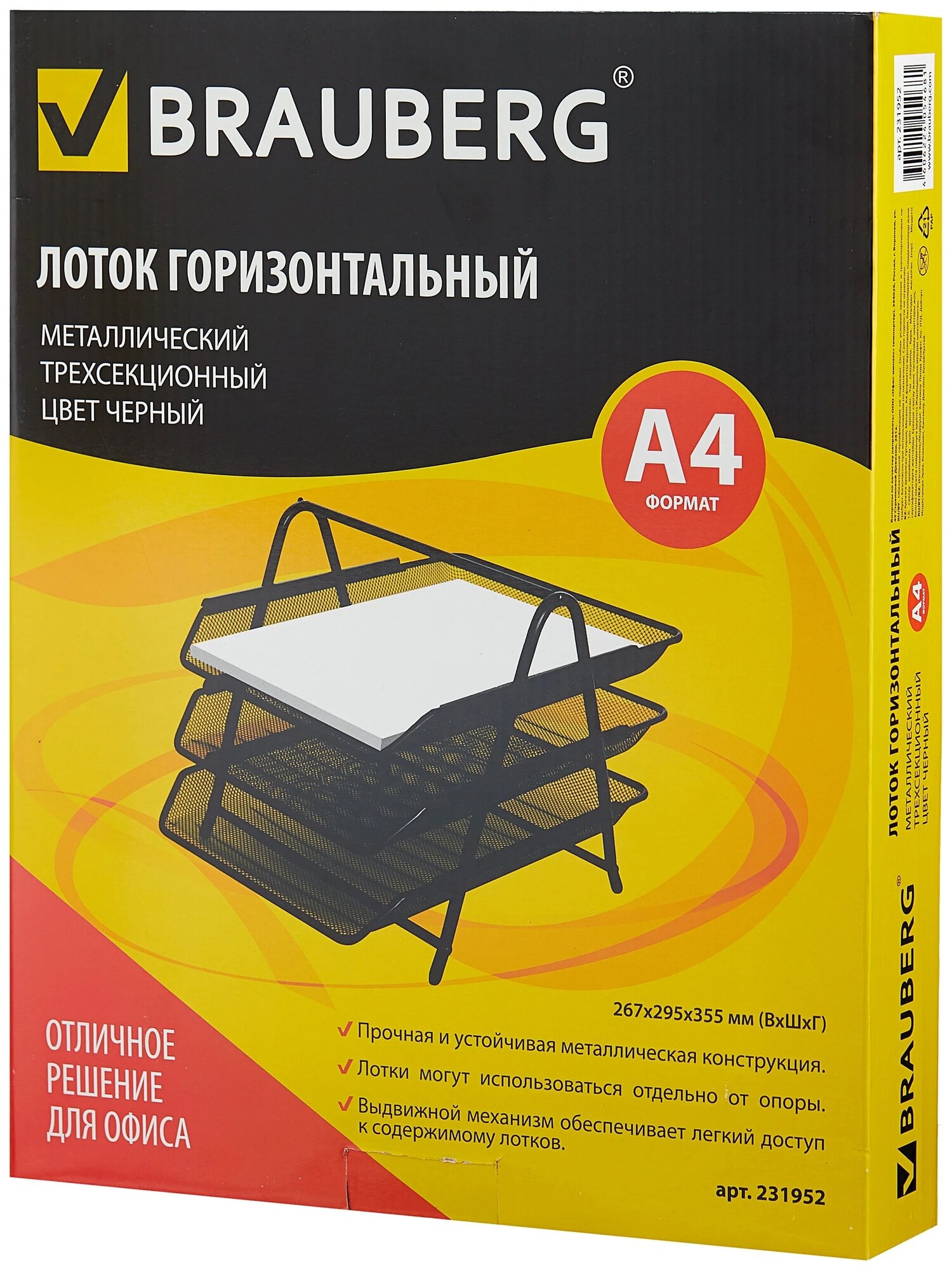 Лоток горизонтальный металлический для бумаг, 3 секции, BRAUBERG "Germanium", А4 (267х355х295 мм), черный, 231952 В комплекте: 1шт.
