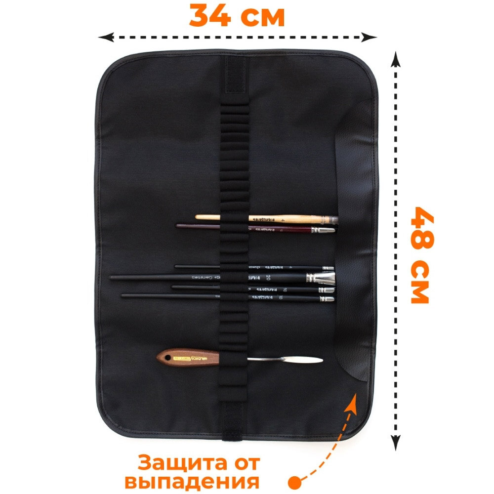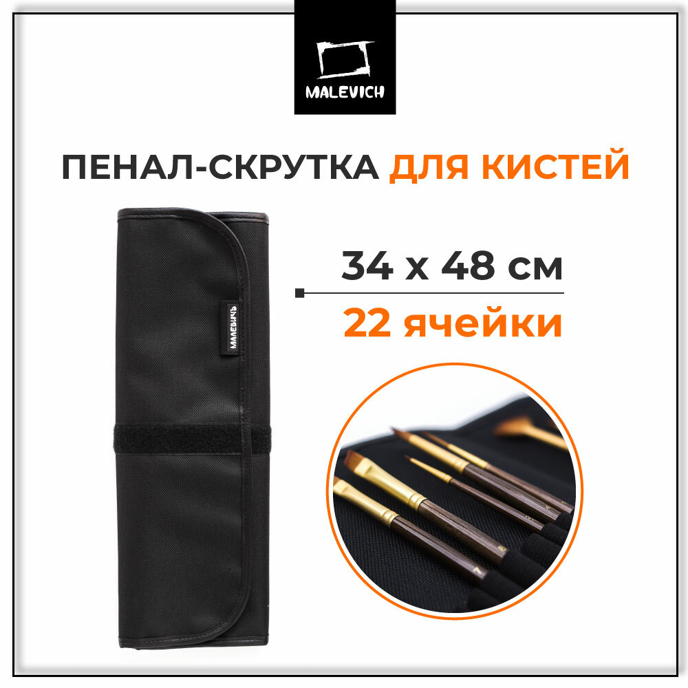 Пенал-скрутка для кистей на липучке, 340 х 480 мм, на 24 предмета, Малевичъ, чёрный 195006 1 708 ₽