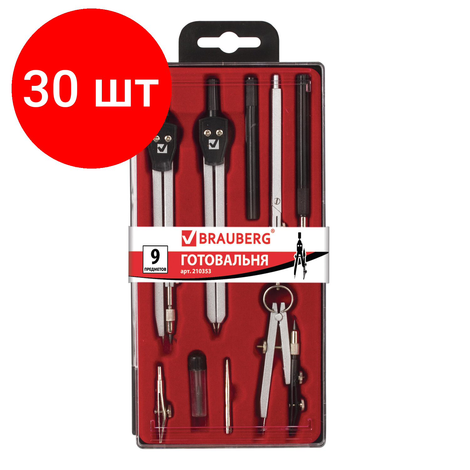 Комплект 30 шт, Готовальня BRAUBERG "Architect", 9 предметов: циркуль + измер + кронциркуль, рейсфедер + держатель, 2 вставки, удлинитель, грифель, 210353 информация: