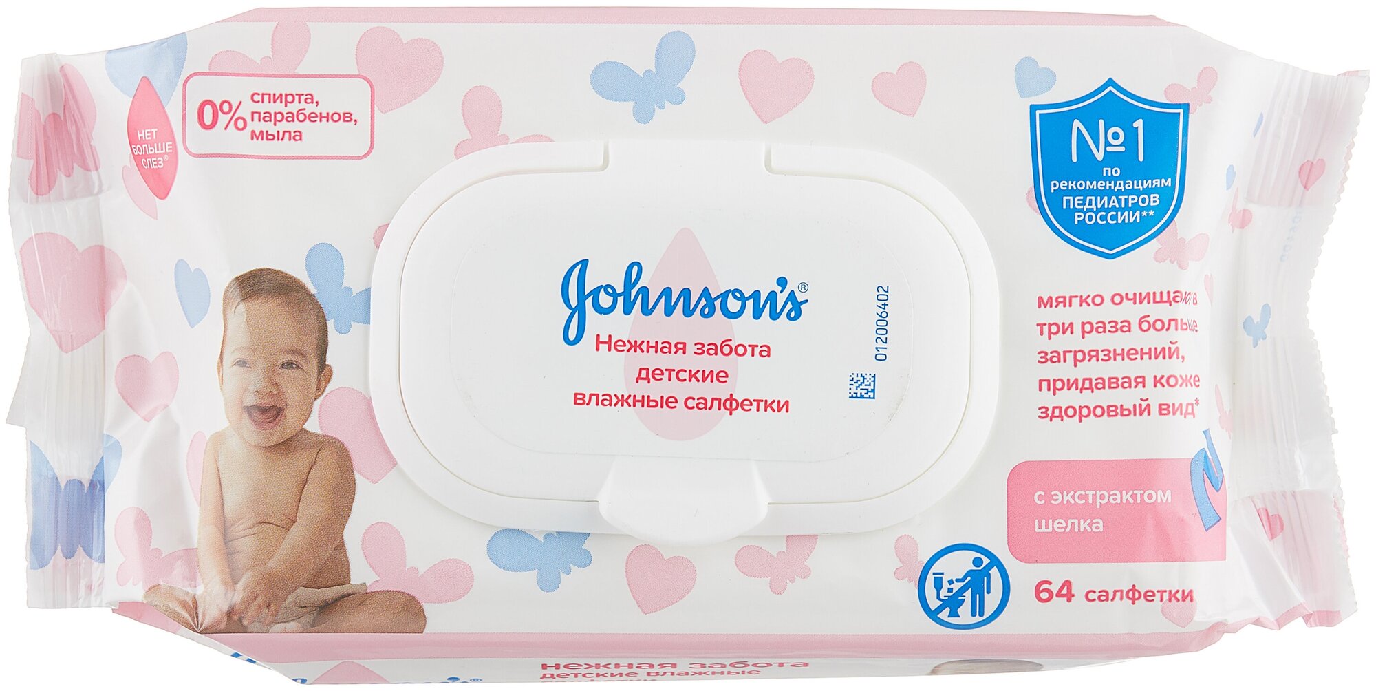 Влажные салфетки JOHNSON'S Baby для новорожденных Нежная забота с экстрактом шёлка, пластиковая крышка, 64 шт. информация: