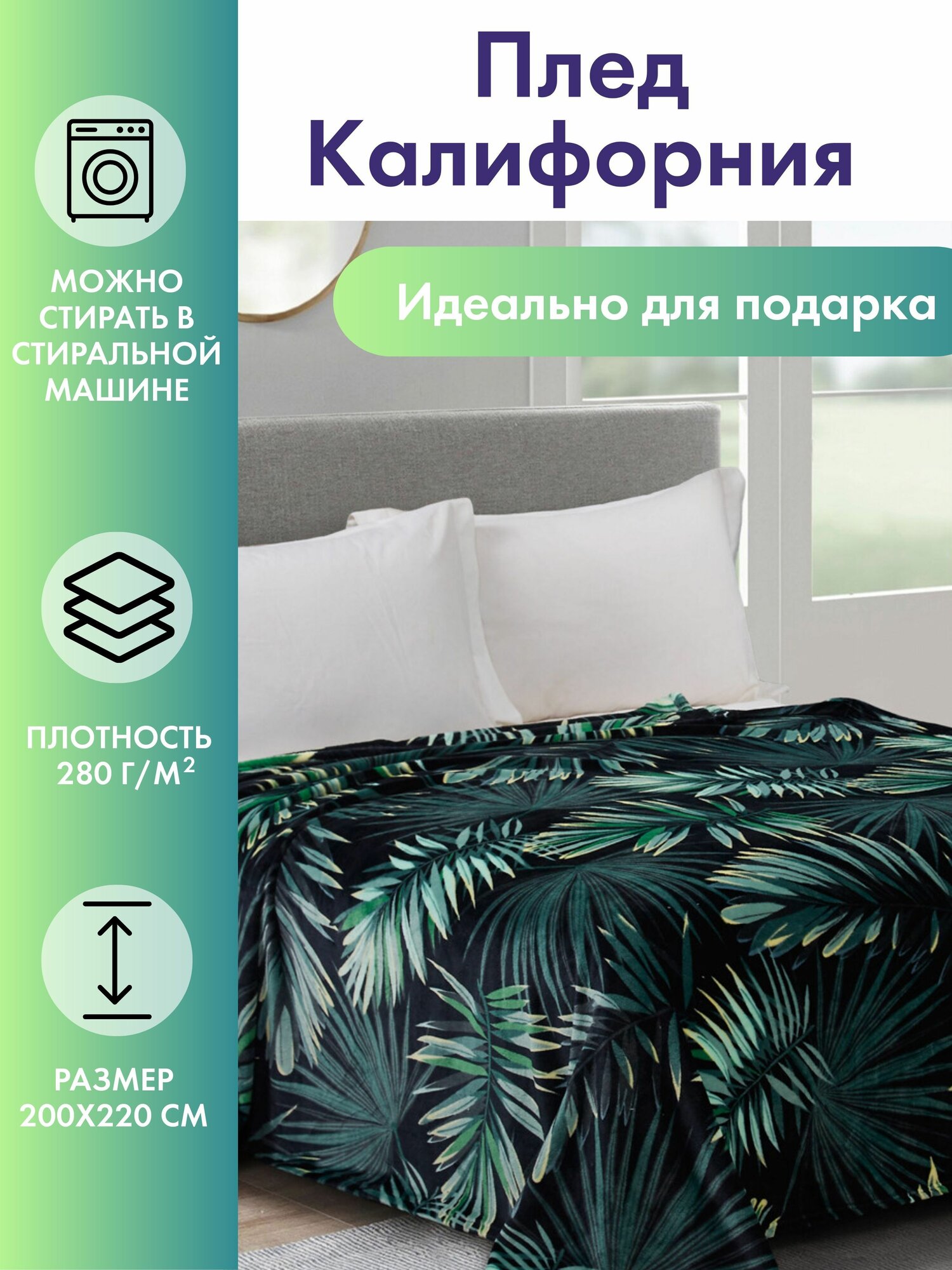 Отзывы на Плед двуспальный евро 200х220 зеленый, покрывало на кровать и диван Cleo California, пушистый с рисунком, флисовый, велсофт
