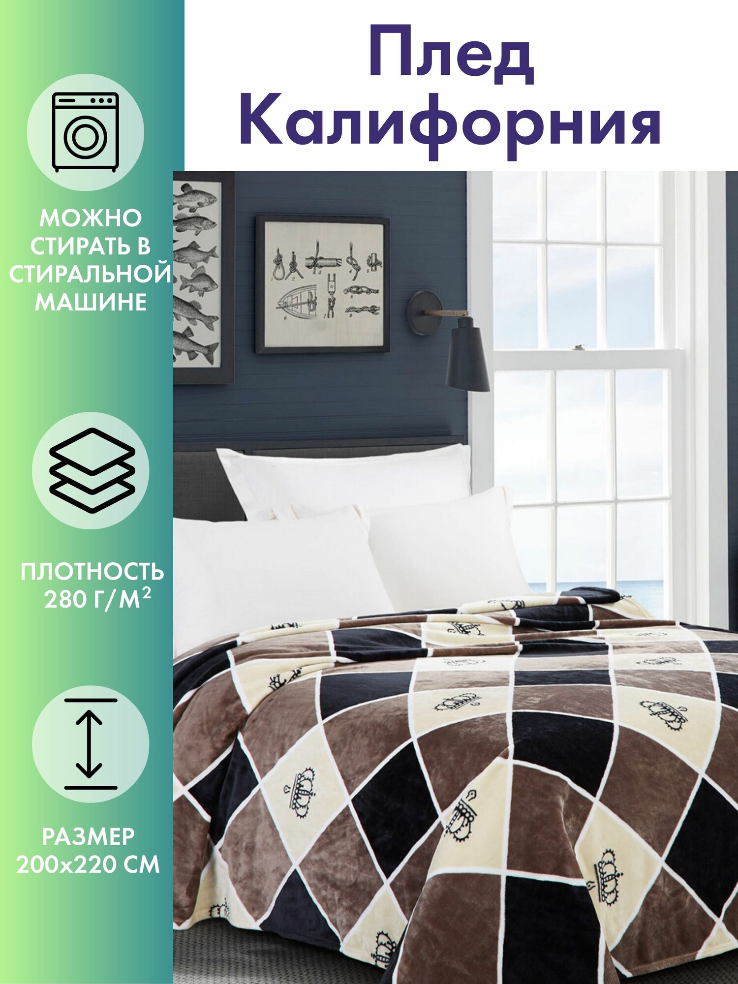 Отзывы на Плед двуспальный евро 200х220 в клетку, покрывало на кровать и диван Cleo California, пушистый с рисунком, флисовый, велсофт