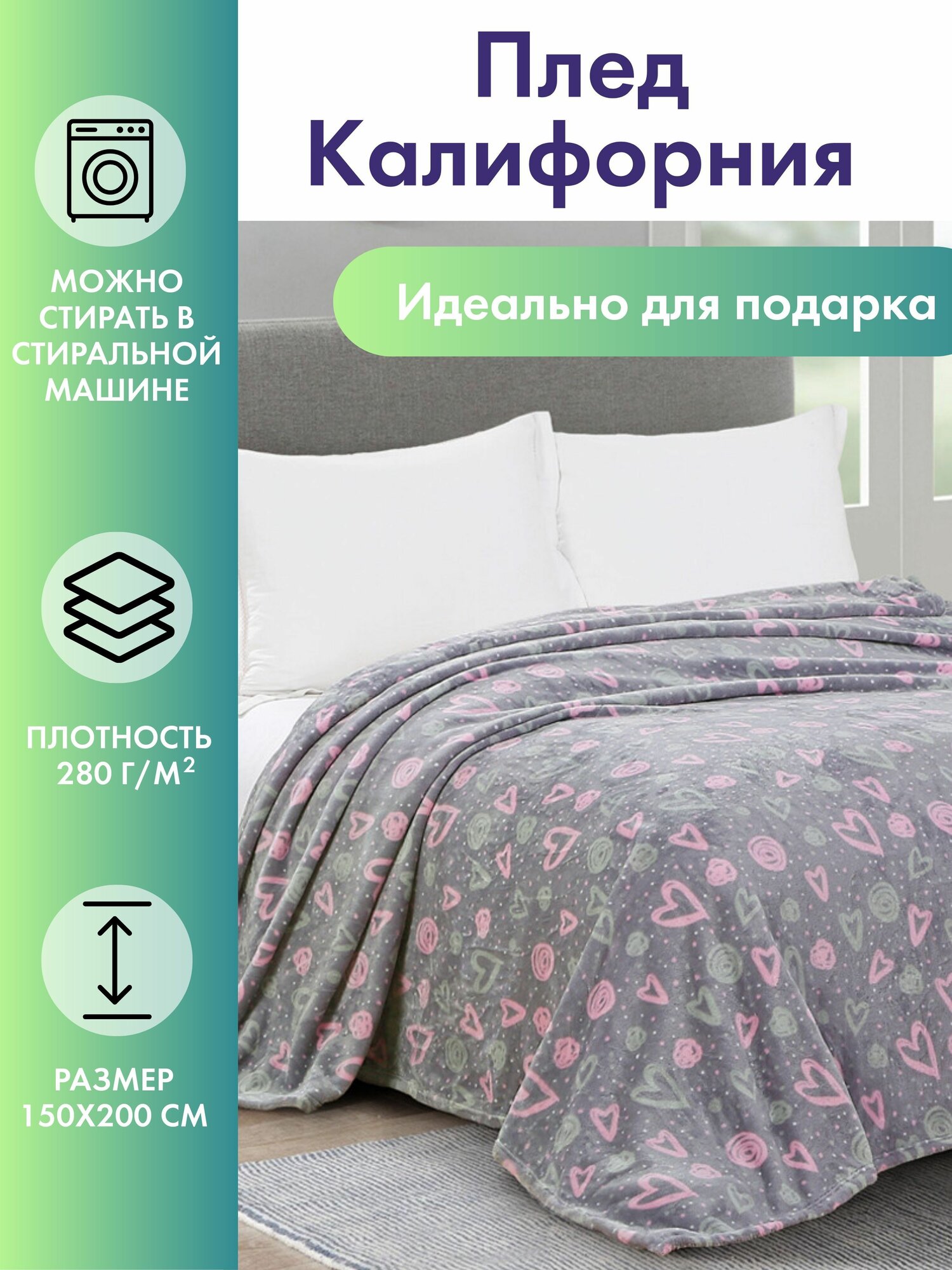 Отзывы на Плед полуторный 150х200 серый с сердечками, покрывало на кровать и диван Cleo California, пушистый с рисунком, флисовый, велсофт