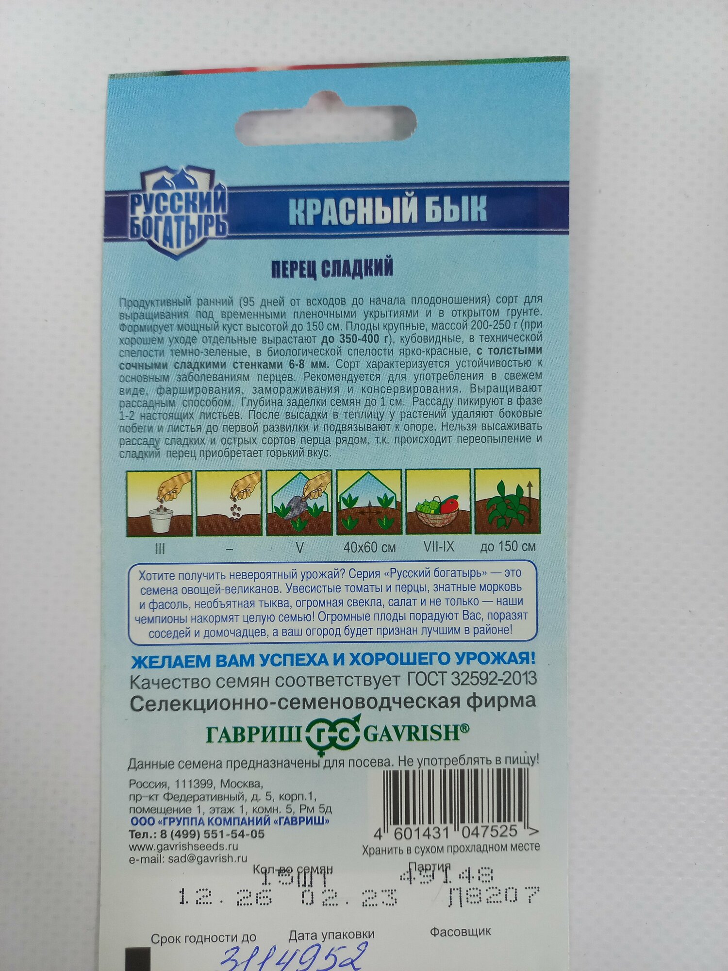 Перец сладкий Красный бык 15шт. Русский богатырь (Гавриш) информация:
