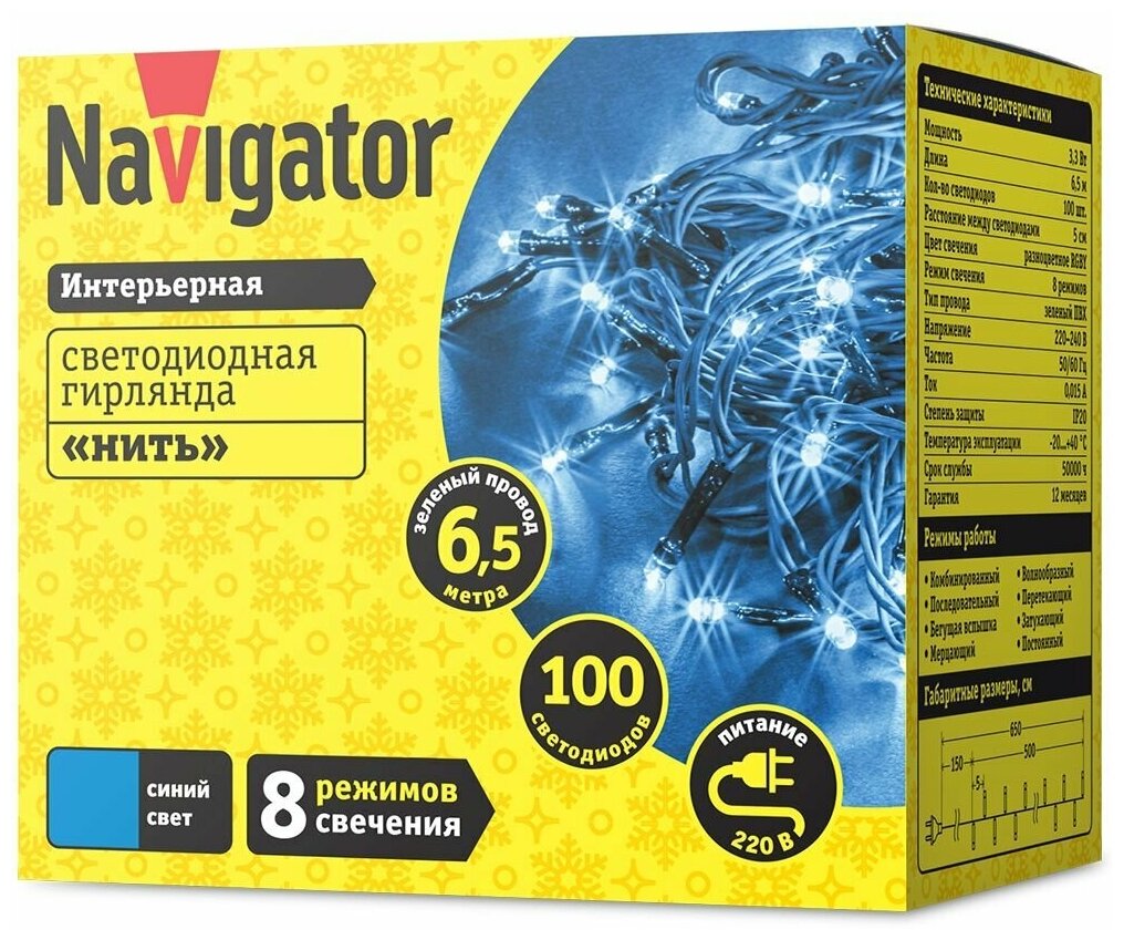 Гирлянда светодиодная Нить Navigator 61 821, 11.5 м, синий свет, зеленый провод, IP20 информация: