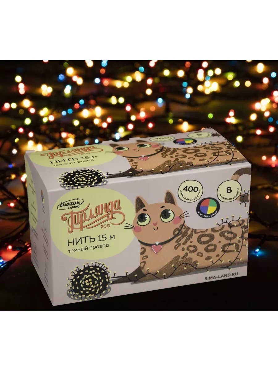 10 цен на Luazon Lighting Гирлянда «Нить» 15 м, IP20, тёмная нить, 400 ламп, свечение мульти, 8 режимов, 220 В