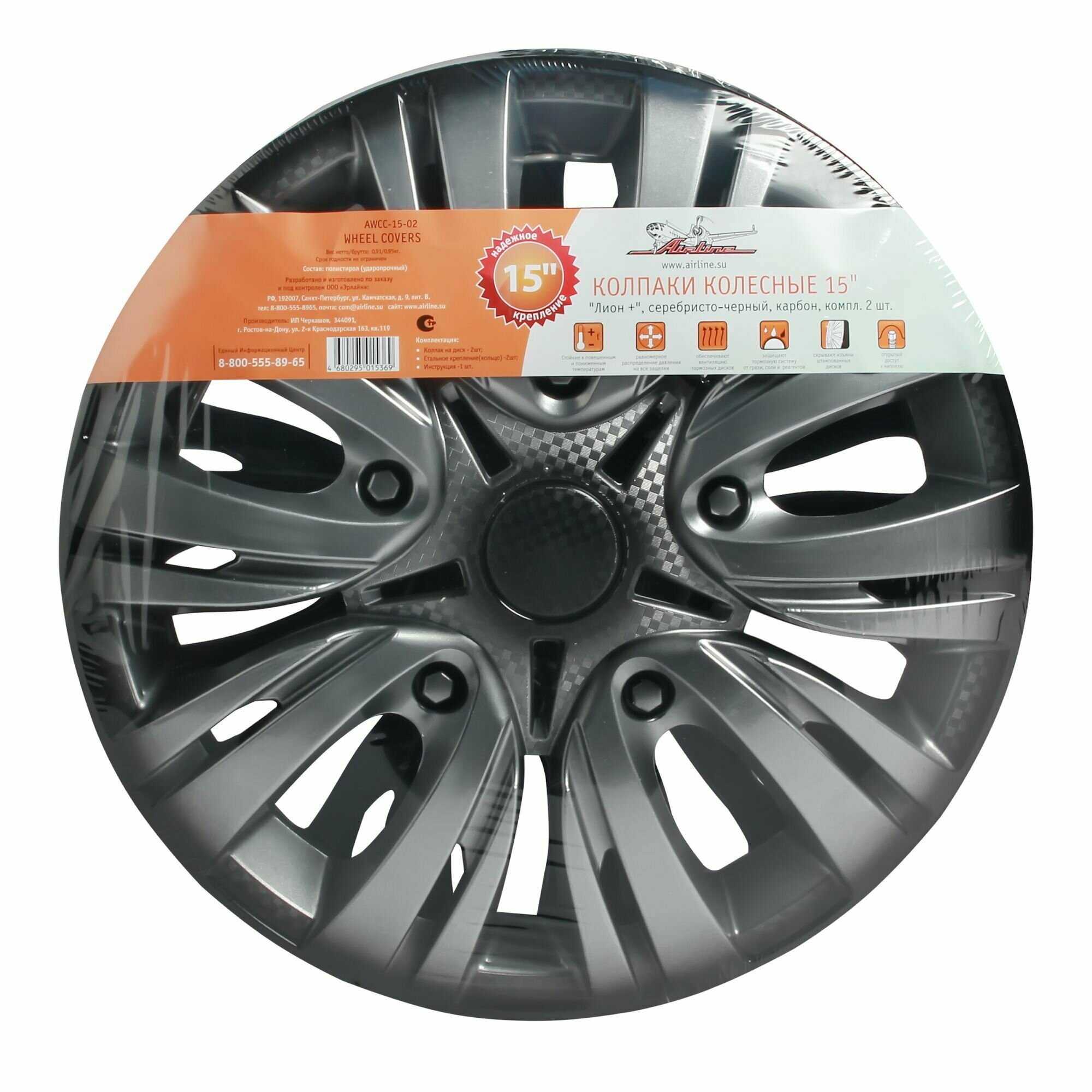 Колпаки колесные 15" "Лион +", серебристо-черный, карбон, компл. 2 шт. AWCC-15-02 AIRLINE информация: