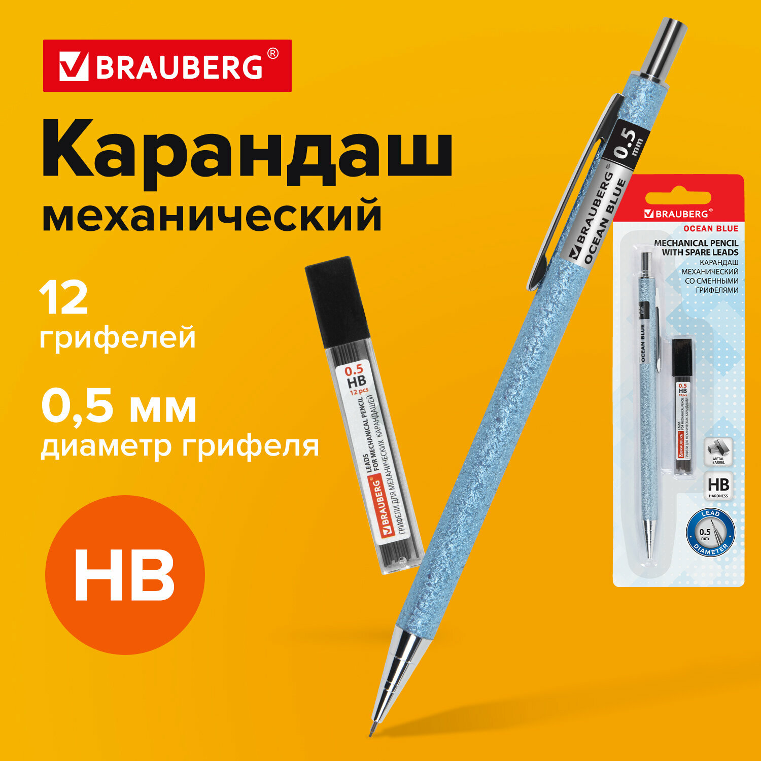 10 цен на Механический карандаш 0,5 мм + грифели Hb 12 штук на блистере, BRAUBERG "OCEAN BLUE", 181970