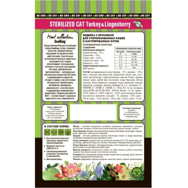 Сухой корм ZooRing Sterilized индейка с брусникой для стерилизованных кошек, 400г информация: