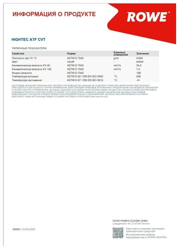 ROWE 25055001099 Масо трансмиссионное HIGHTEC ATF CVT (1) 7 730 ₽