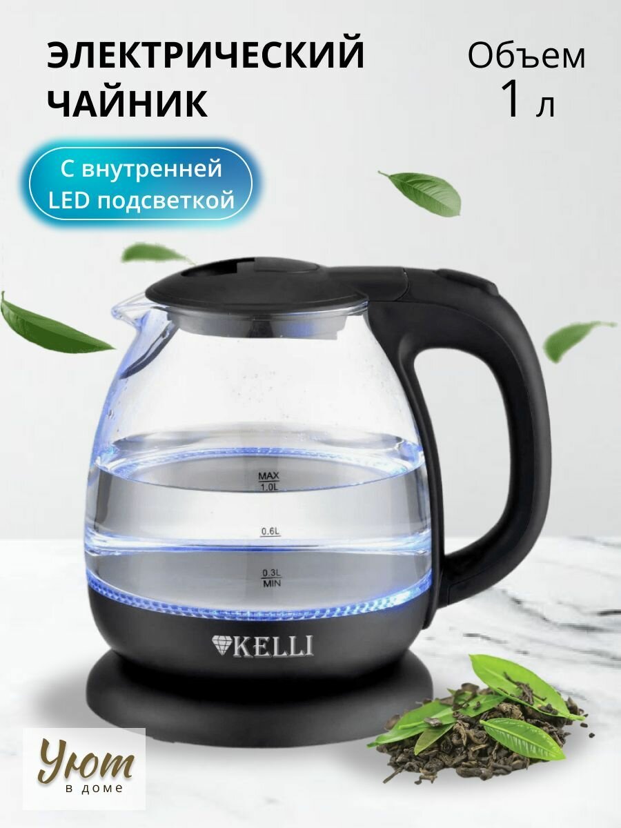 Kelli Чайник электрический KELLI KL-1370, стекло, 1 л, 1100 Вт, чёрный