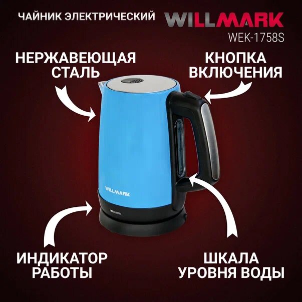 Чайник электрический WILLMARK WEK-1758S 1.7 л, 2.2 кВт, голубой информация:
